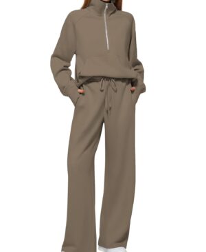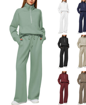 Woman Solid Color Half Zip Long Sleeve Sweatshirt And Wide Leg Pants Set Casual Sporty Two Piece Outfit Women's Suit