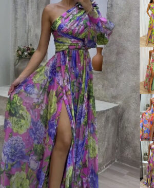 Floral Print Split Maxi Dress Fashion Sexy One-shoulder Long-sleeved Dresses Summer Beach Clothing For Women