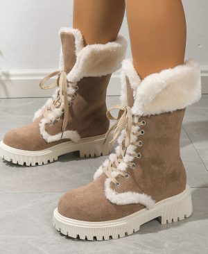 Winter Lace-up Snow Boots For Women Mid-tube Fleece Shoes Warm Chunky Heels Plush Boot