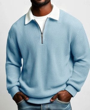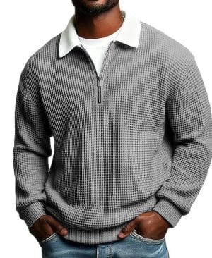 Men's Solid-Color Waffle-Weave Long-Sleeve Lapel Zip-Up Shirt