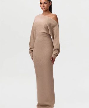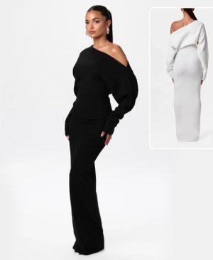 Ins Slim Long Sleeve Knitted Dress Evening Party Sexy Off-shoulder Bodycon Long Dresses