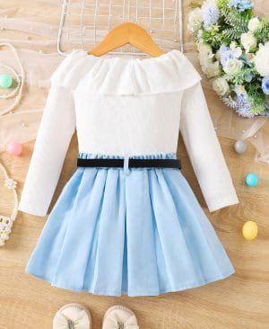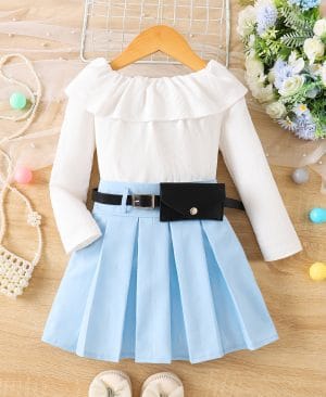 V-neck Ribbed Long-sleeve Pleated Skirt With Belt Three-piece Set
